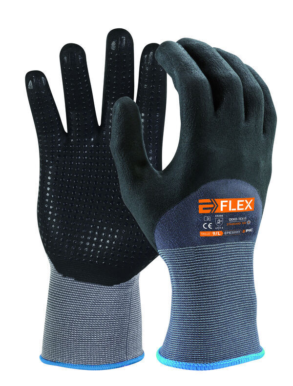 Gants support tricoté polyamide/spandex. Jauge 15. Enduction 3/4 micromousse de nitrile avec picots sur la paume. Poignet tricot élastiqué. | Utilisés pour les travaux en milieux gras et huileux.