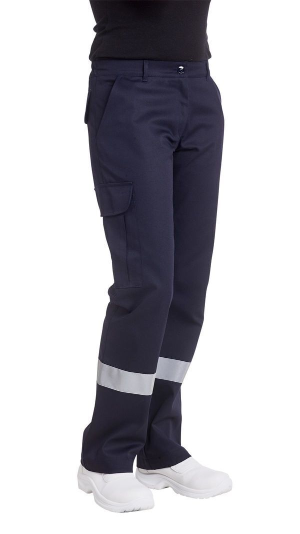 Pantalon ambulancier femme. Ceinture élastique côtés avec 7 passants. Braguette zippée. 2 poches italiennes. 2 poches cuisses à rabat fermé par Velcro®. Poche stylo sur cuisse droite. 2 poches arrières à rabat fermé par Velcro®. | Bandes rétroréfléchissantes 30 mm. E.J. : 78 cm (+ 6 cm).