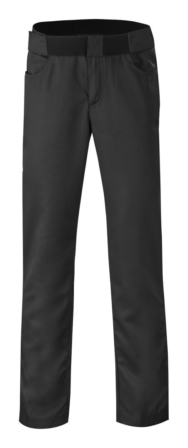 Pantalon mixte 5 poches. Ceinture avec élastique transfert d’humidité. Taille ajustable avec 2 pattes à élastique auto-agrippant à la ceinture. 2 poches cavalières avant avec poche ticket. 2 poches plaquées dos. Bas de jambe réglable sur 3 positions par système de pressions. E.J. : 82 cm.