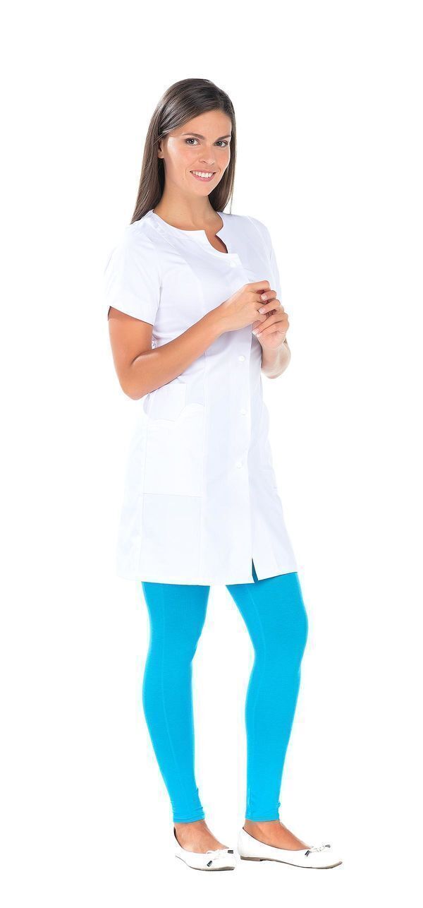 Tunique femme ajustée. Fermeture milieu devant par pressions. 2 poches basses. 2 poches BIP. Manches courtes. 2 fentes dos. Coupe ajustée. Longueur : 85 cm.