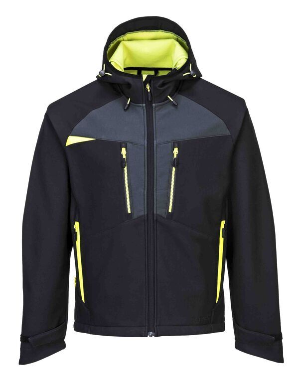 Softshell 3 couches. Fermeture par zip milieu devant, protège-menton. Capuche avec cordon de serrage. 2 poches poitrine zippées avec zip contrastant. Poches basses zippées. 3 poches intérieures dont une avec auto-agrippant. Manches préformées avec bas de manches incurvés, poignets réglables par bandes auto-agrippantes. Zips contrastants. Cordon de serrage bas de vêtement. | Imperméabilité et respirabilité 8K/3K.