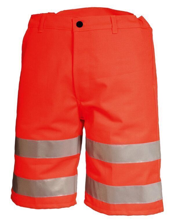Bermuda haute visibilité. Ceinture élastiquée côtés, fermée par fermeture à glissière et bouton. Poches italiennes. Poche dos plaquées. Bandes de 50 mm rétroréfléchissantes.